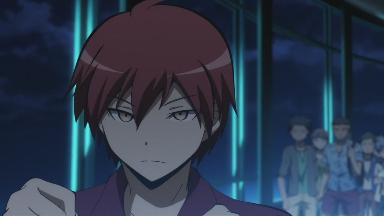 Карма противостоит в рукопашном бою в киллером. Хватка обязывает и приступает к дуэли. Парнишка легко уворачивается и блокирует все движения, понимая, что если попадётся, то это будет конец. Карасума признает движения Кармы как свои собственные, делая вывод, что тот, вероятно, наблюдал, как он уклоняется от атак с ножами его одноклассников, несмотря на то, что приоритетное значение самообороны с точки зрения убийства так низко. Киллер спрашивает, когда его противник будет атаковать, поскольку победить его-единственный путь вперед. Карма уверяет его, что он мог легко отвлечь убийцу от того, чтобы товарищи проскользнули мимо, но не будут прибегать к такой тактике.