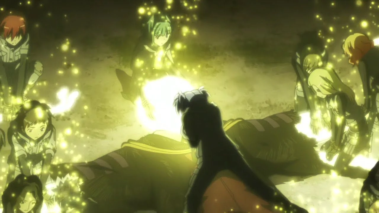 Nagisa Shiota, who chose to deliver the killing blow, becomes overwhelmed by his emotions. In response, Korosensei softly places a tentacle on his cheek and tells that he wants Nagisa to kill him with a smile on his face. After giving each other their final farewells, Korosensei is stabbed in the heart and his body dissipated into numerous light particles.
