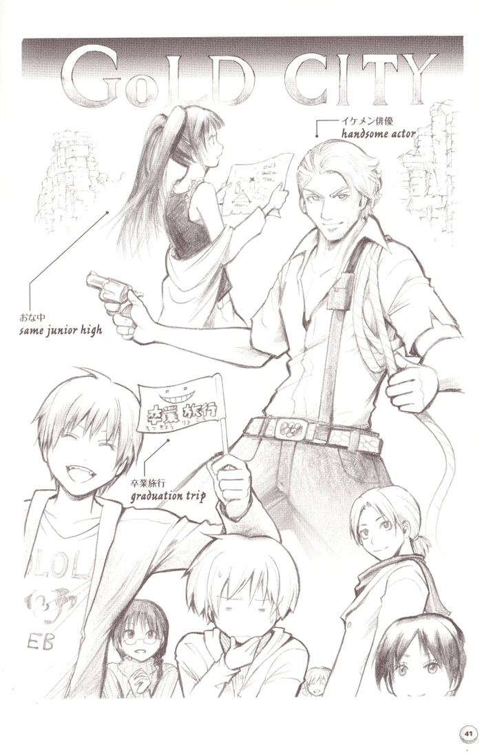 The group soon finds out the film Kayano is shooting is based on a novel titled "Gold City", where a hero who lusts for riches helps a Japanese girl, and thinking she is infatuated with him, subsequently protects a Buddha statue from brigands for her sake. Thinking the filming site was taking place in a temple-like setting, everyone is given a handbook of possible filming locations by Nagisa. Takebayashi volunteers to find the specific temple the filming was taking place by comparing the backgrounds of the photos and promotional pictures Ritsu found (the gang discovers the film stars a young movie star named Jerome March). Using this method, he manages to find a temple in Nagisa's handbook that had a high chance of being the filming location. Ecstatic, the former class readies themselves for the upcoming trip.